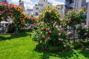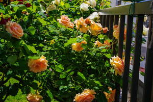 バラが見頃になってきました。パーゴラのつるバラはほぼ満開。木立のバラも次々と開花しています。でも夕方から突然の雷雨。まだバラは開き始めなんで、まだ雨では散らないとは思うんですが、どうでしょう。