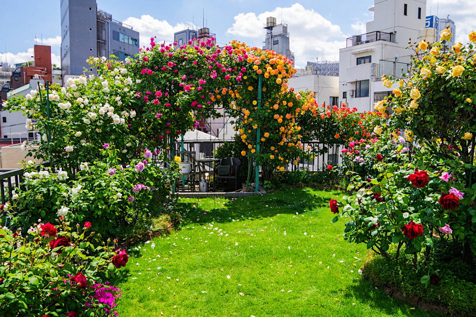 バラが見頃になってきました。パーゴラのつるバラはほぼ満開。木立のバラも次々と開花しています。でも夕方から突然の雷雨。まだバラは開き始めなんで、まだ雨では散らないとは思うんですが、どうでしょう。