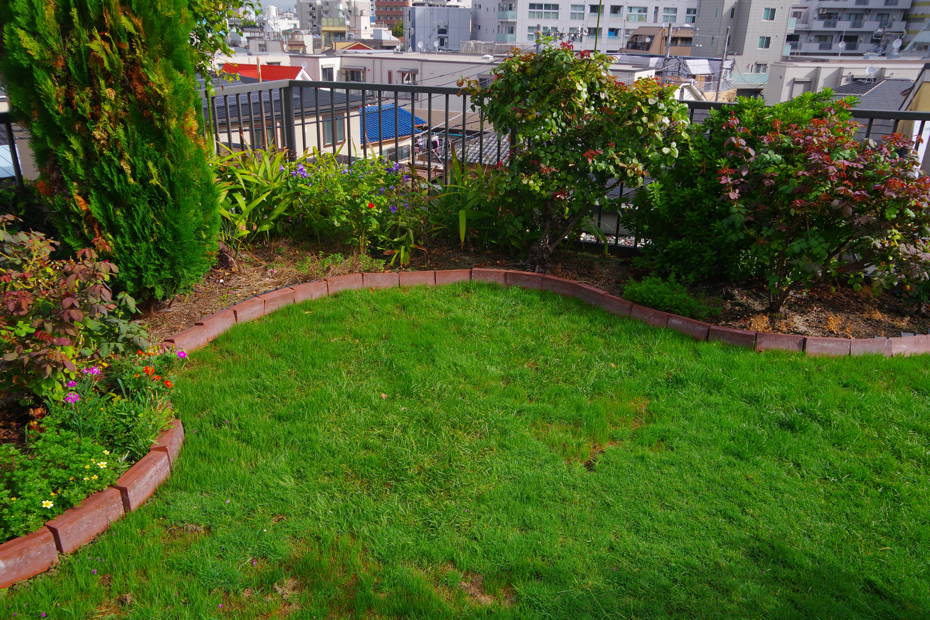 芝生の補修で、最後に種を蒔いたあたりも発芽してきました。